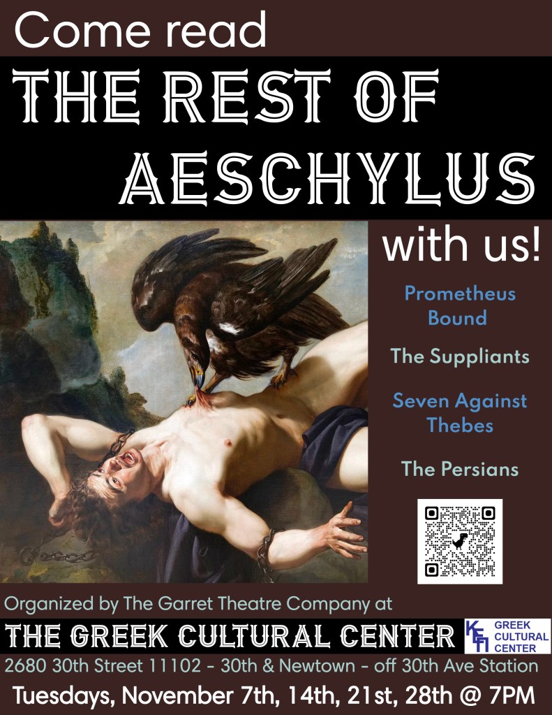The Garret Theatre Company is kicking off a Greek Reading Series in partnership with the Greek Cultural Center. Readings will begin in October with the plays of Aeschylus.
